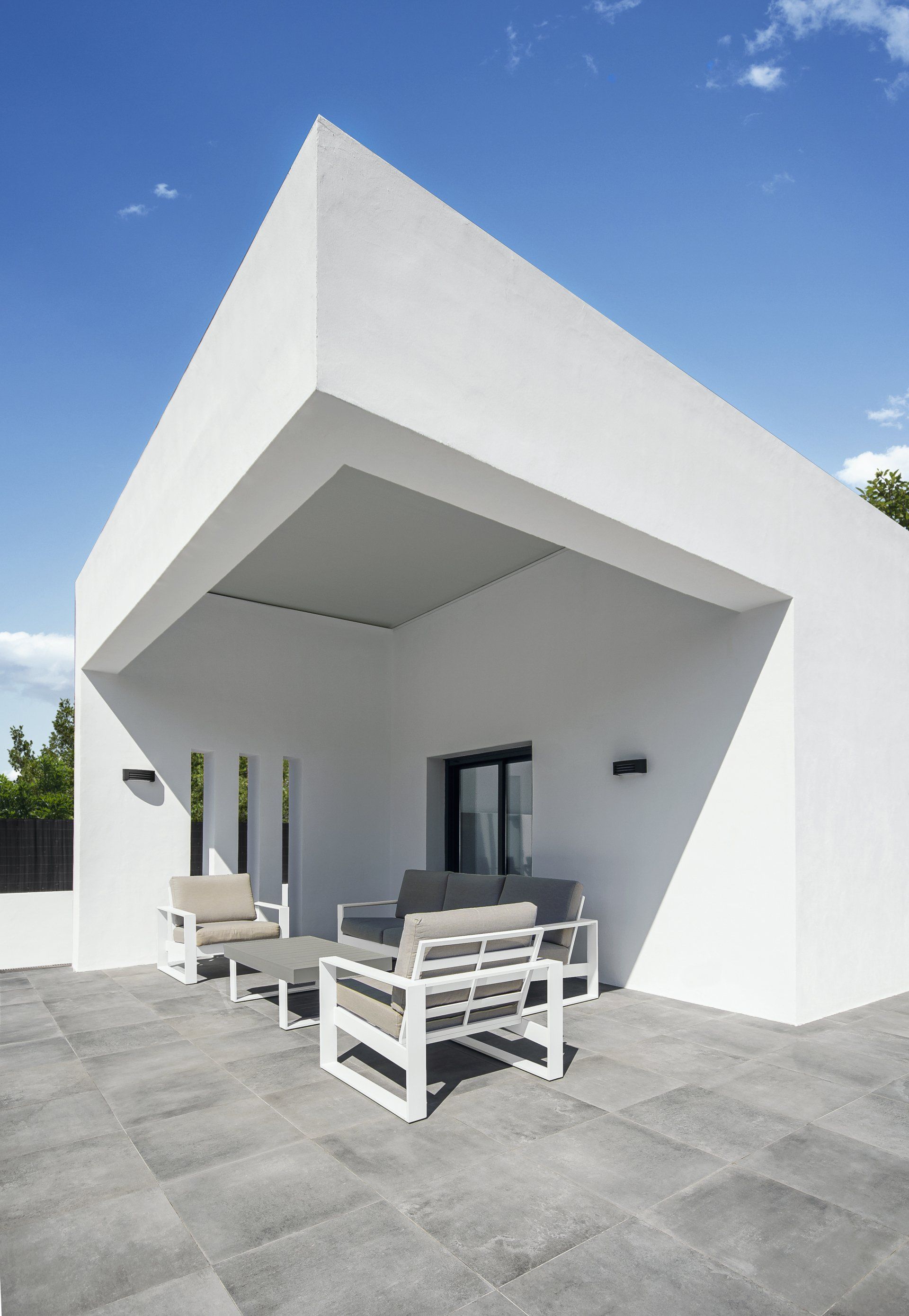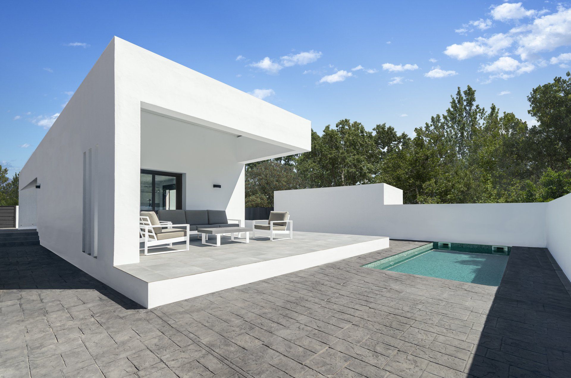 The implementation of the house on the plot by our architect responds to a double objective: - Locate the house as close to the street as possible to maximize the rear garden and obtain the greatest privacy. - In the same way, we get as close as the ordinance allows to its north side boundary, in this way we seek to optimize natural light on the south face by moving it away from its dividing wall. The access from the street to the plot is located on the narrow east side, how do we solve it from an architectural point of view? The simplest answer would be located on that narrow main façade that responds to the popular belief that when you enter a single-family home you have to walk as few meters as possible. The creativity of our architects proposes something different. By means of a ramp and a setback in the wall we create a route, a totally blind façade (as it is the closest to the neighbor) that frames the elegant main entrance, achieving a suggestive interplay of volumes of light and shadow. A gesture as simple as original that leads us naturally from the street to the heart of the building. In addition, it is the best solution from a functional point of view, since it places the main entrance in the center of the building, optimizing the interior layout of the house, dividing the night and day areas at each end. On one side are the three bedrooms, the main one with an en-suite bathroom, all facing south with plenty of natural light as they are separated from the dividing wall, on the other side the living-dining-kitchen area, which is the one with access to the porch and outdoor terraces. The importance of the North wall goes further, extending beyond the volume of the house, being one of the only two points of support of the porch with the rear façade, undoubtedly an outstanding element of the building. The porch unfolds in this way in a light cantilever without pillars, powerful with two large beams and its vertex defying gravity. The result of the design and architecture carried out distances us from more conventional projects in the area. The façade that makes up the main entrance and a very special porch confer a plus of elegance, distinction and exclusivity to this building.