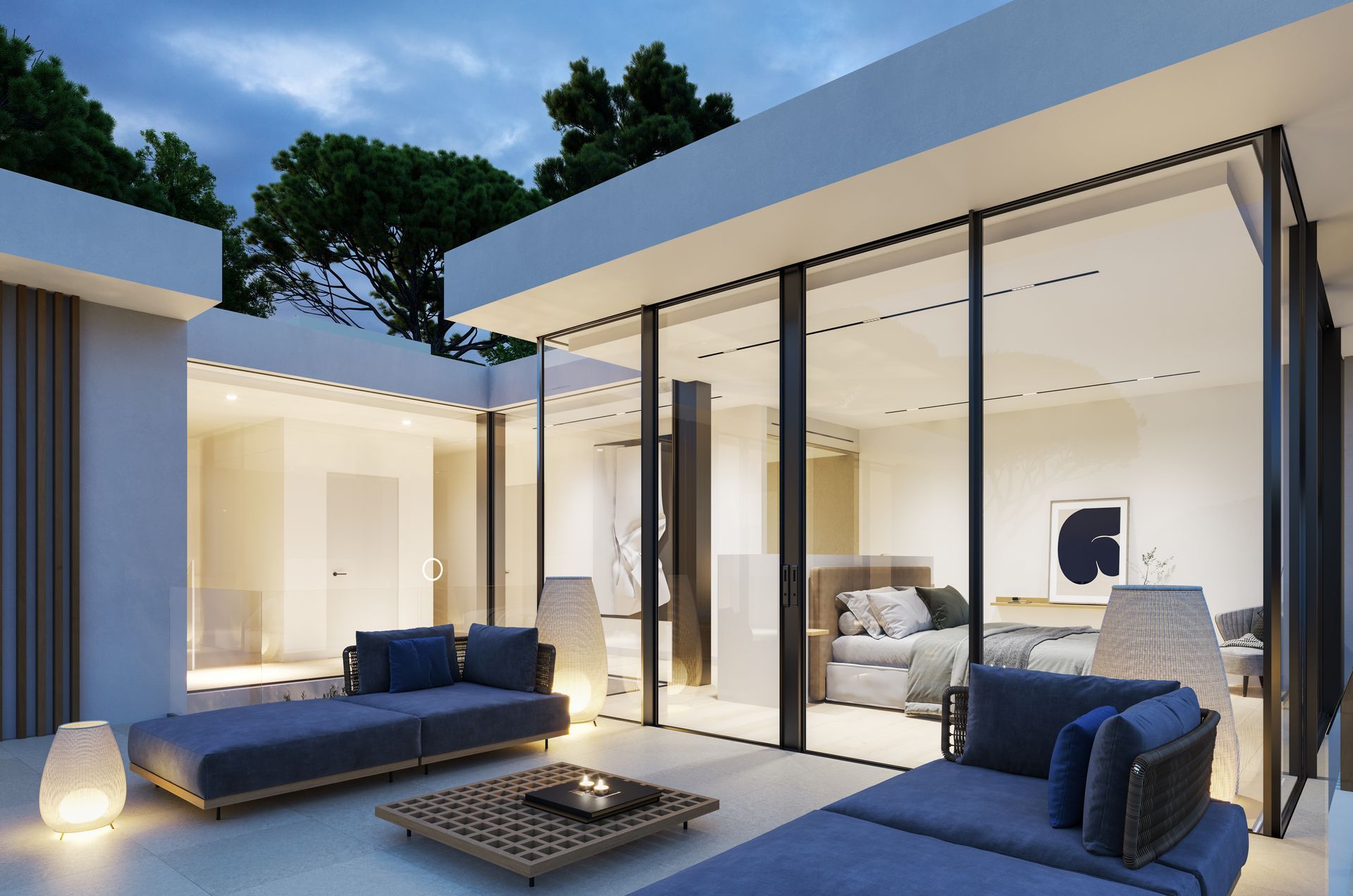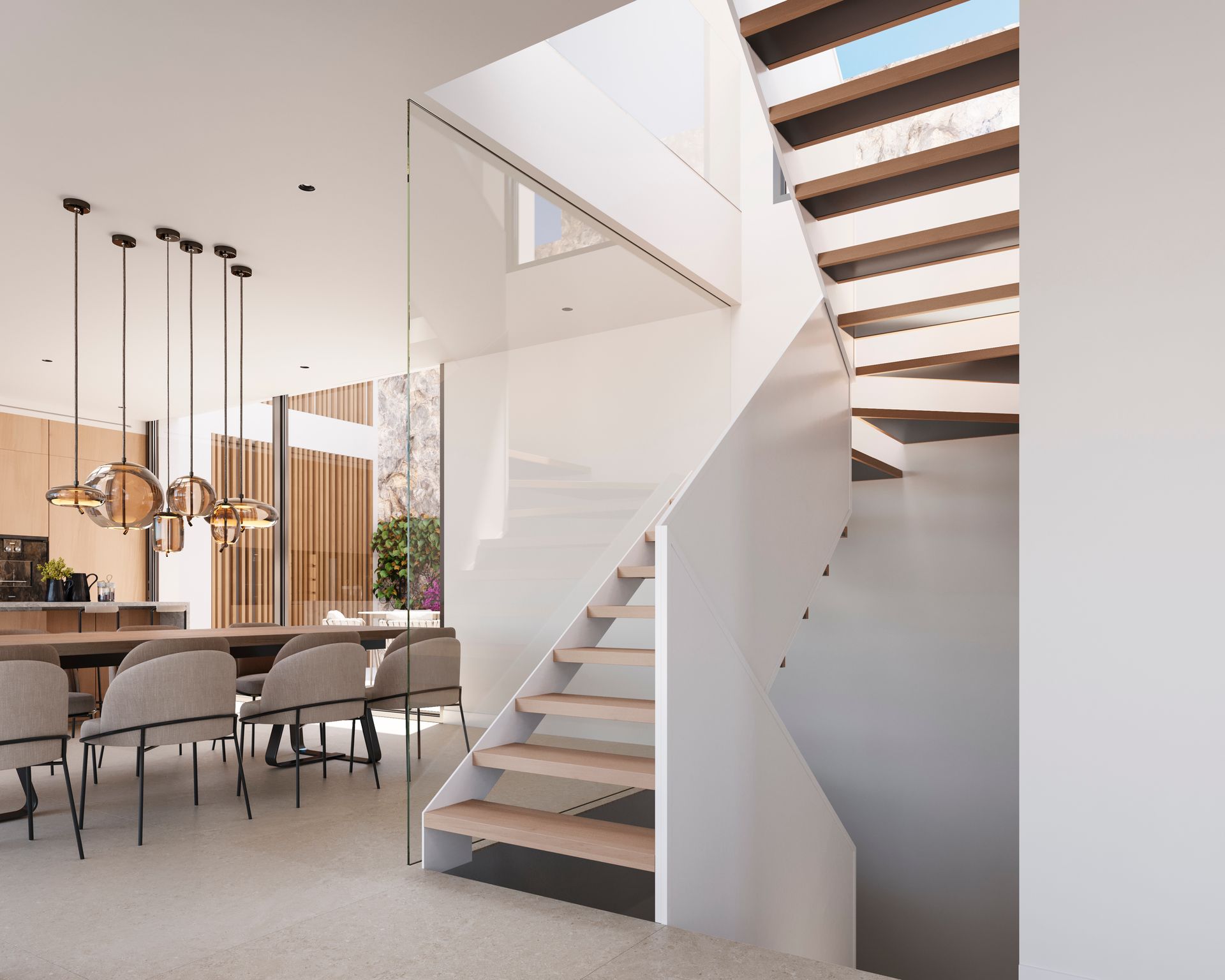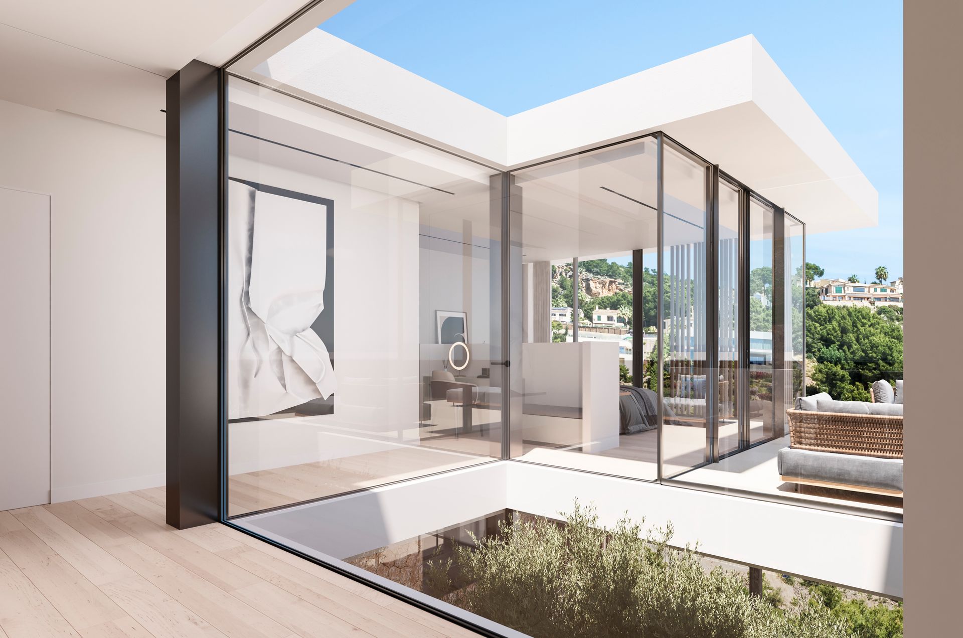 The façade is dominated by an enclosure of large sliding windows from slab to slab that, once open, allow us to understand the house as a large open porch to enjoy the home during the long periods of mild weather on the island of Mallorca. The prominence of this architectural project is the permeability between the landscape and the house. As the axis around which the house is organized, a glazed patio is proposed that allows the entry of direct light from the south. Integrating nature and construction in this patio with an olive tree, a typical crop tree of the Mediterranean.