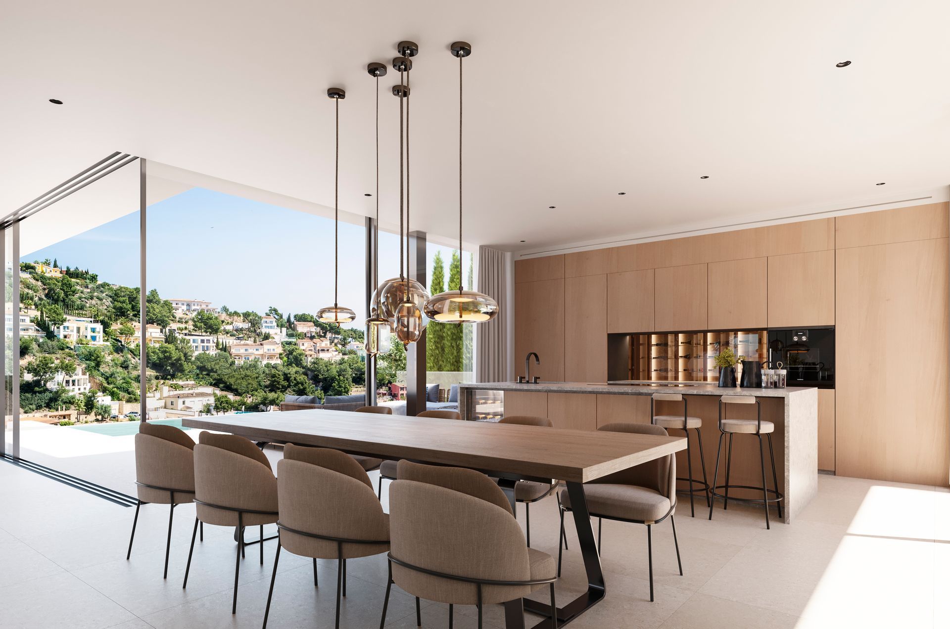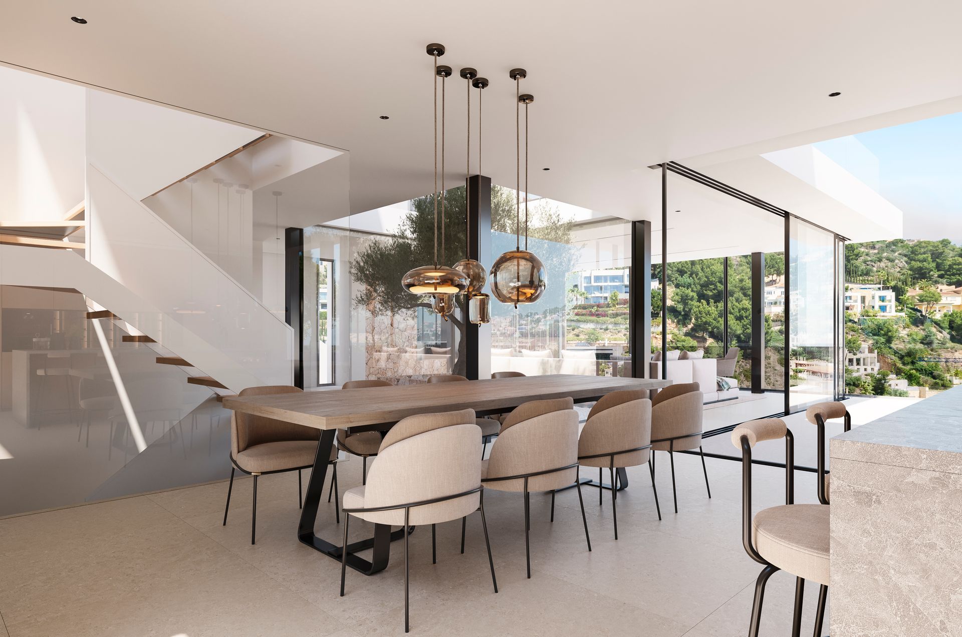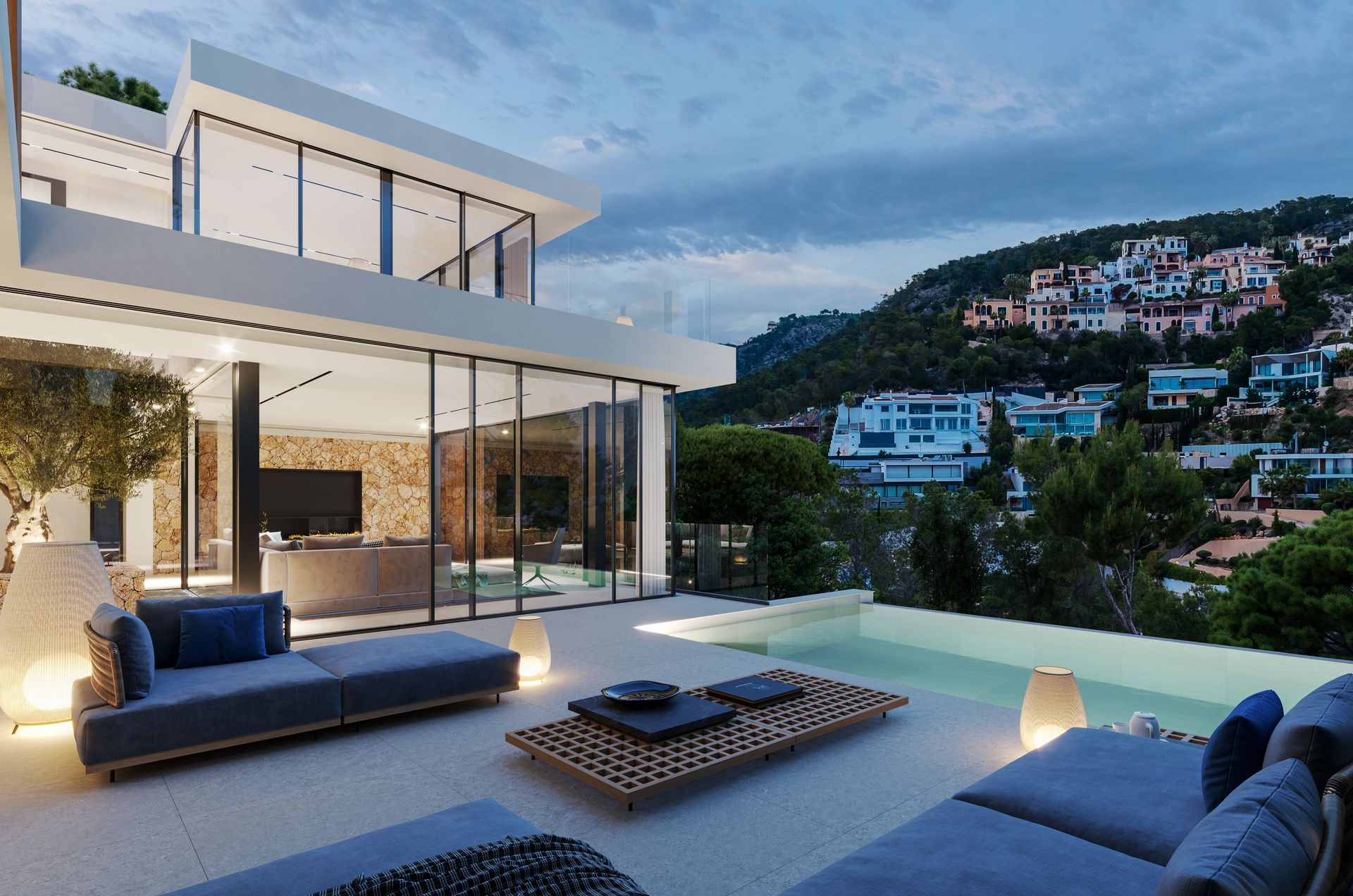 The Costa d'en Blanes urbanization is a residential area dominated by single-family homes for permanent residence or second residence in the tourist town of Calvià, on the island of Mallorca. Our architectural project is located on some hills very close to the coast where we can find the exclusive marina of Puerto Portals. It is a site with a steep slope that descends to the north and its north orientation. Access, both pedestrian and road, is made from the lowest area of the site. It has unobstructed views to the north, looking at another of the hills of the urbanization, and to the northeast it has a view of the Mediterranean Sea.
