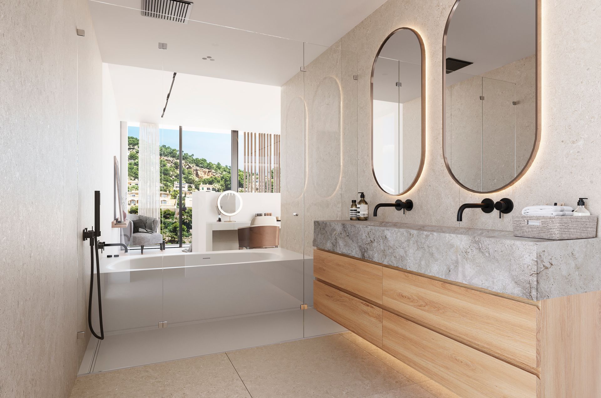 The kitchen is open to the space, with simple lines and noble materials, with wood finishes that give warmth to the ground floor and that allows the wine cellar to be seen through it. In the living room, a seamless stone wall stands out, a nod to the limestone walls typical of the island of Majorca. On the lower floor, a gray zarci stone floor is proposed both inside and outside, to give continuity to the space and increase the perception that there is no distinction between inside and outside. The few doors are blank without flashing, remaining completely camouflaged in the wall.