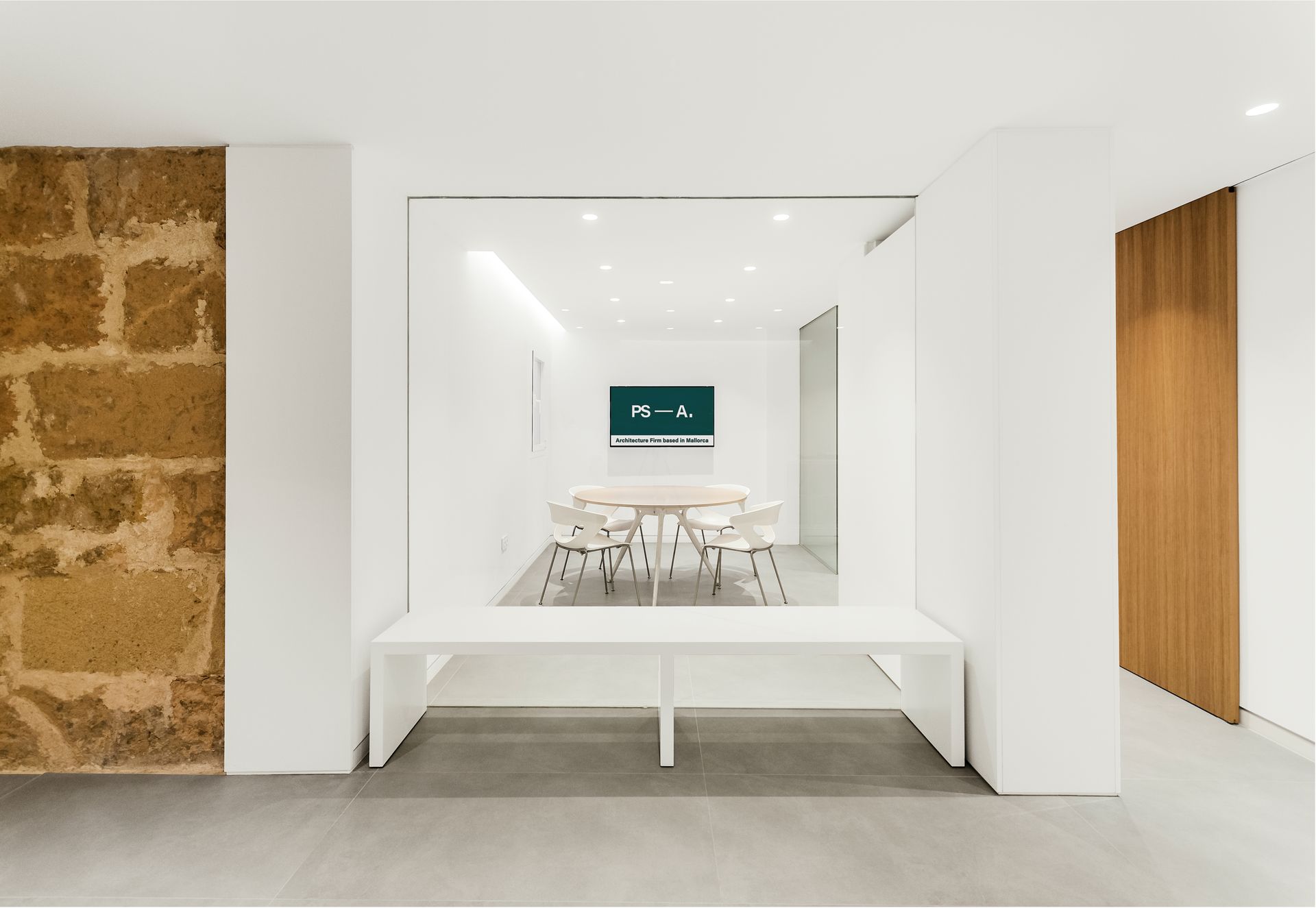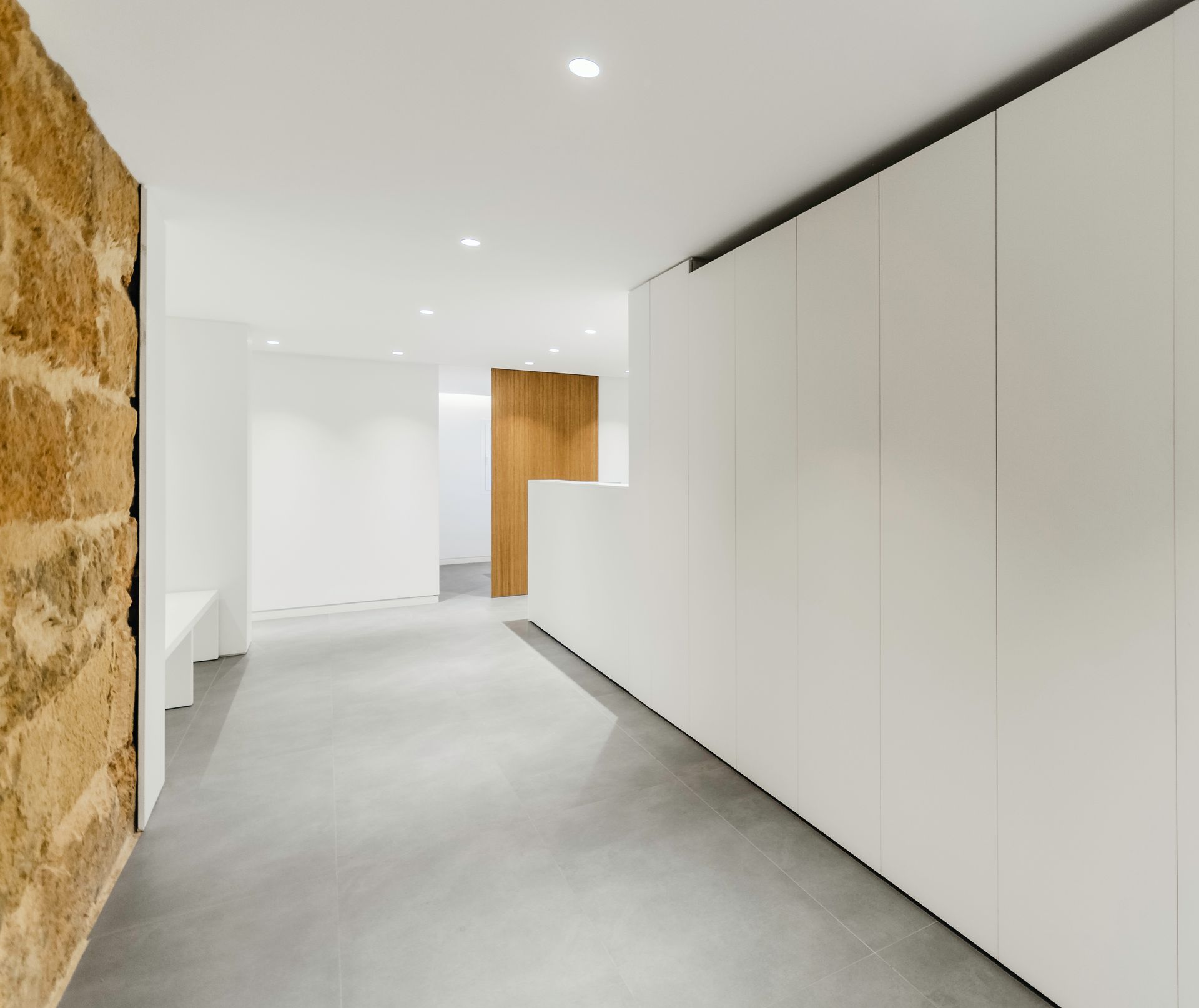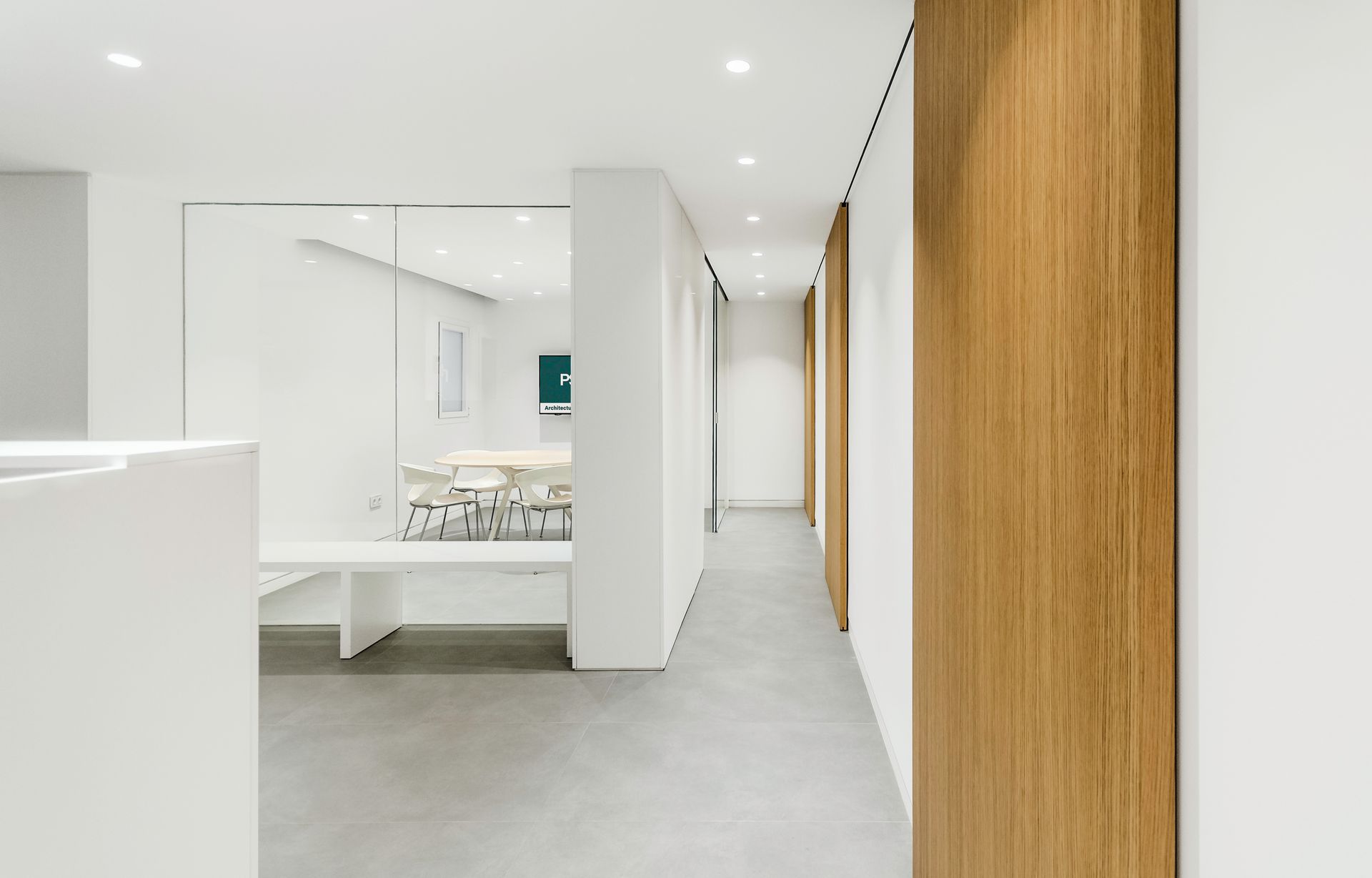The palette of textures and colors has been reduced to the maximum, where the sliding oak doors that go from floor to ceiling and the old marés wall of the building stand out against the white. Of the lighting, the recessed spotlights in the form of a grid stand out as the main lighting and the LED light baths located within the recesses of the perimeter walls as secondary lighting. Clean, neutral and functional space, minimalist style. The result is a space where we can carry out our work with the greatest efficiency, a pleasant environment where our clients feel at home.