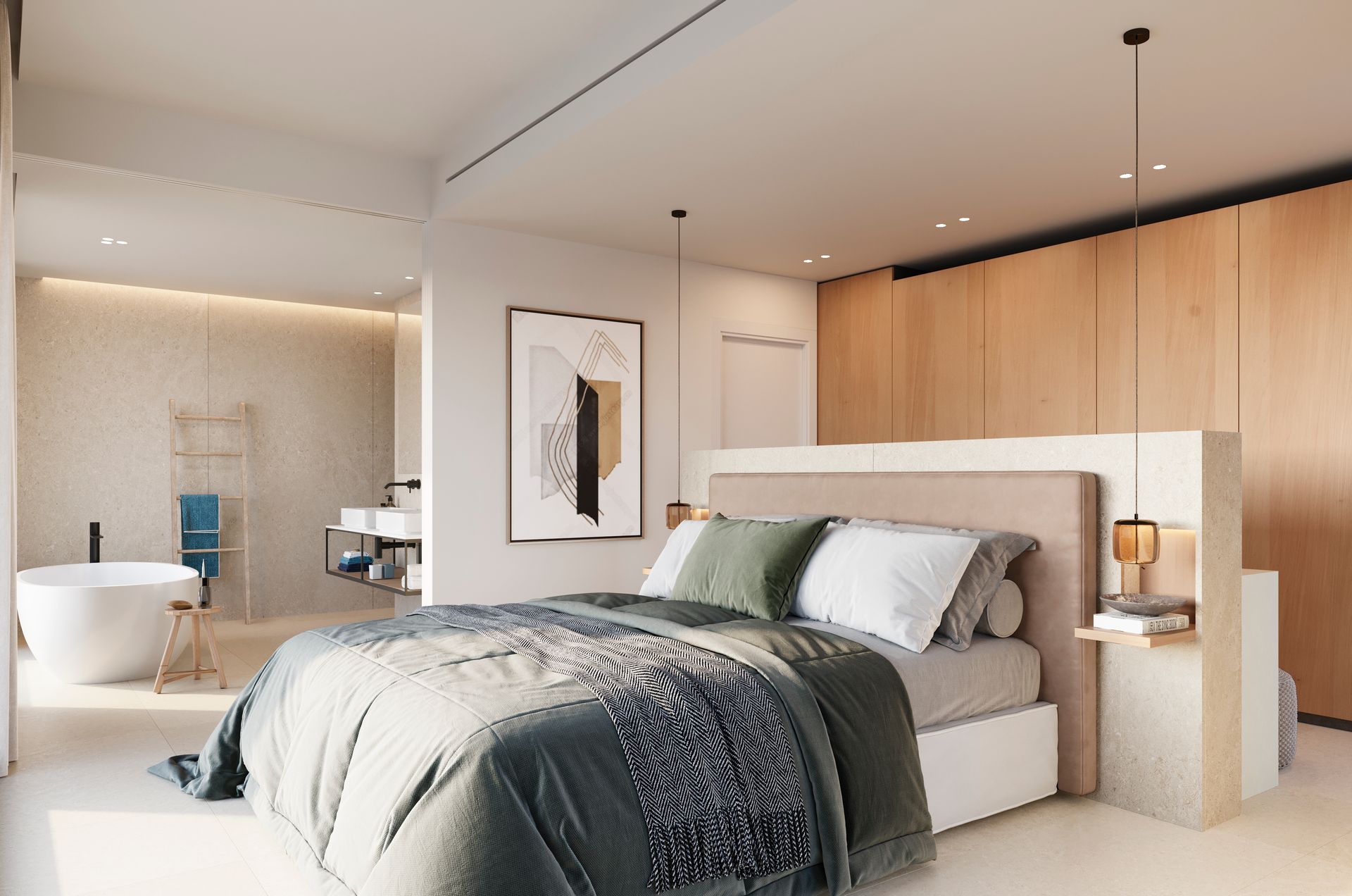 On the upper floor we find the access and the master bedroom with bathroom en suite. The access hall on the upper floor has a double-height opening with a large window facing the street and visually connecting the lower floor with the exterior of the upper floor. The space has plenty of natural light, but both the views towards Palma and the large space made up of the living room, dining room and kitchen are revealed as we go down the metal staircase with wooden steps located on the side of the hole. double height. On the lower floor it is divided into two different areas, the aforementioned day area that opens onto the terraces and pool, and three bedrooms, two bathrooms and a toilet.