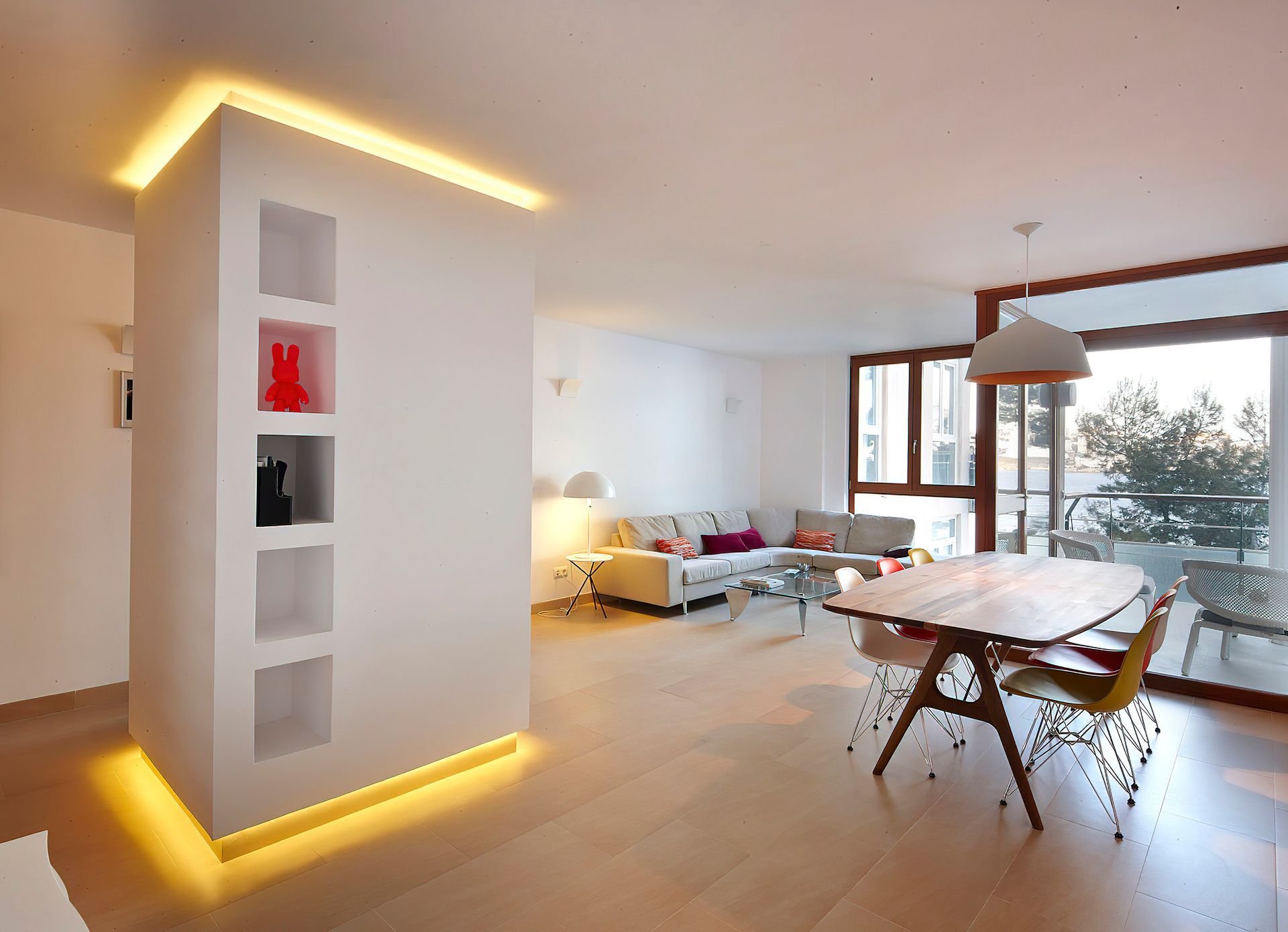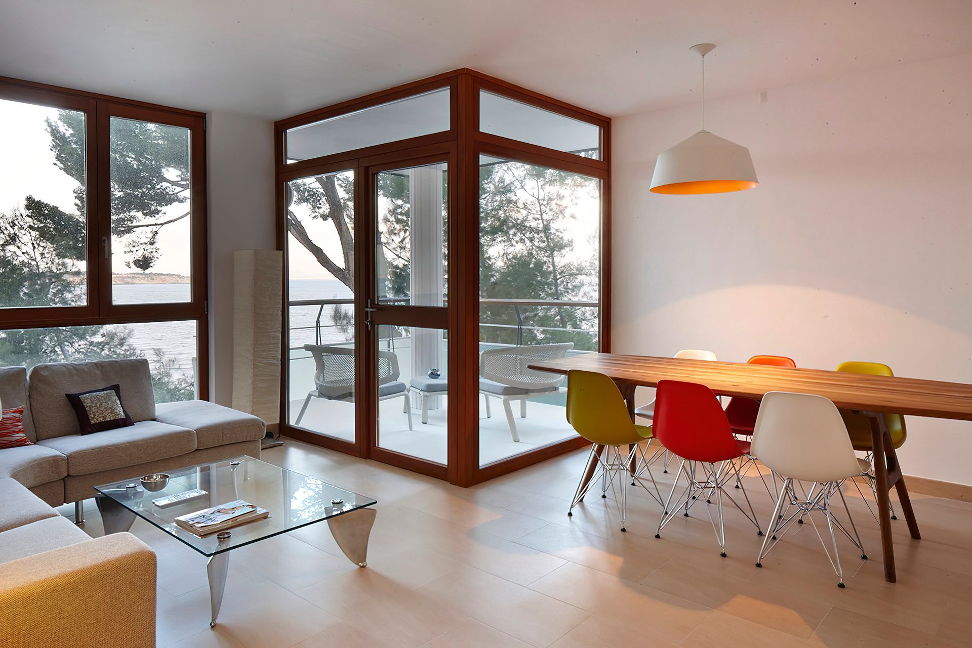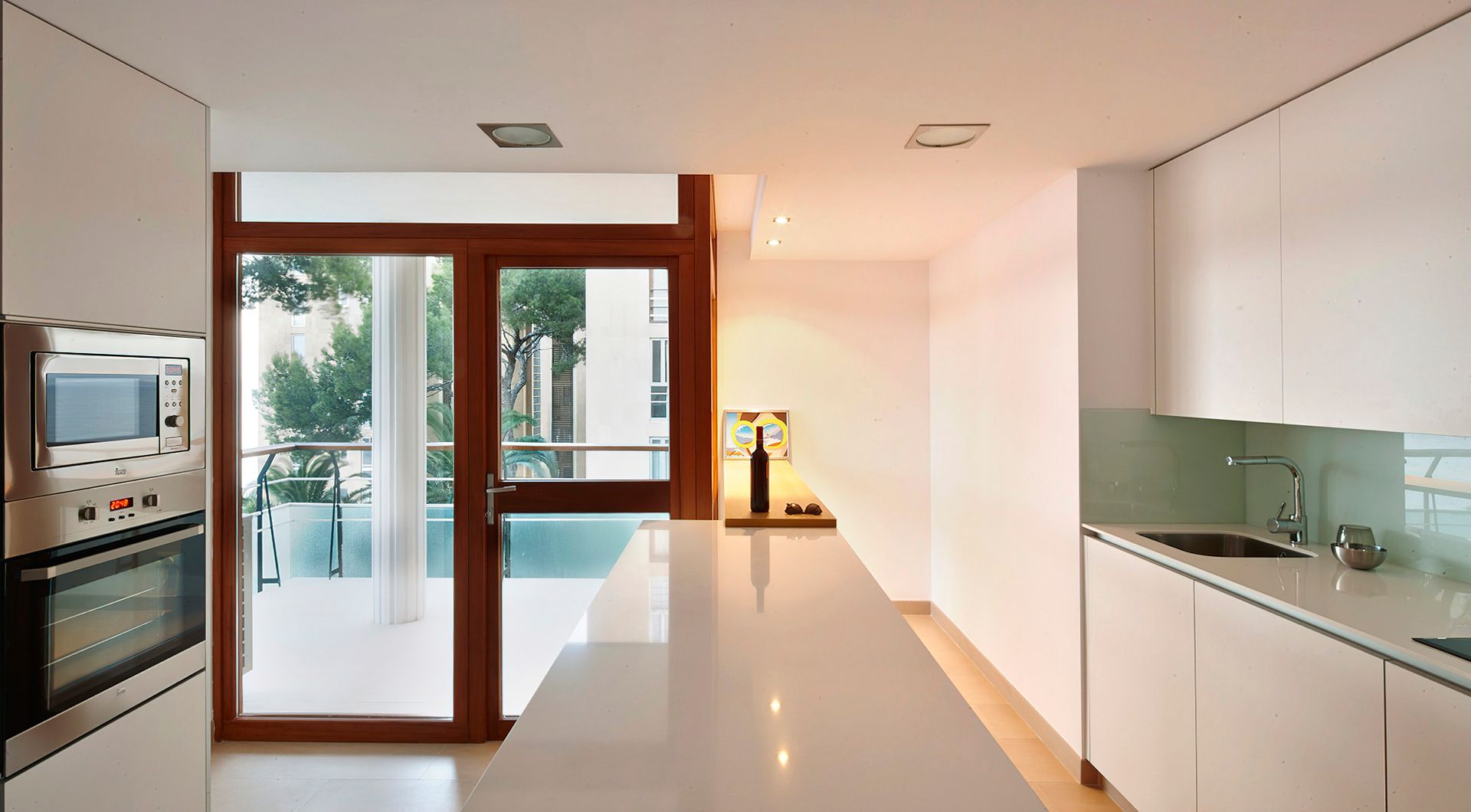 We find many partitions, small spaces that convey an oppressive feeling, something paradoxical in a house with sea views. We tackle the challenge of releasing the full potential of the home, opening it to the Mediterranean Sea and letting light flood its rooms. Our proposal offers a design that plays with the staggered façade of the building, articulating and seeking the maximum amplitude of interior spaces through long internal diagonal visuals and enhancing the privileged views of the sea while also seeking exterior light. The bedrooms are located on the north façade, with smaller façade openings. The materials and colors chosen give serenity to the whole, creating a curtain where the modern design furniture is located. Only three are used throughout the house: iroko wood for interior and exterior carpentry; Porcelain floor with sandstone color and texture (similar to Santanyí stone), and white for the walls and kitchen. The result speaks for itself of the transformation experienced and the success of the intervention.