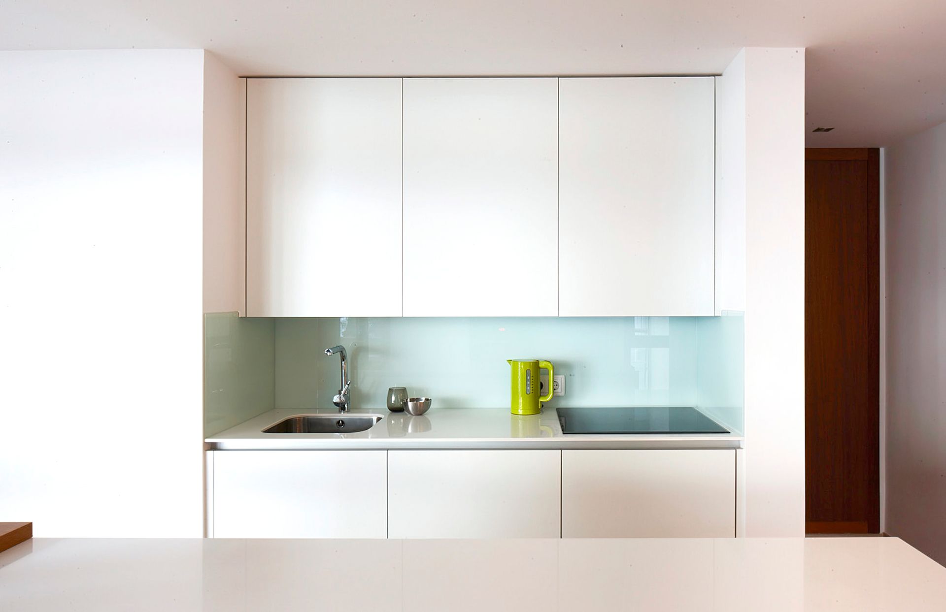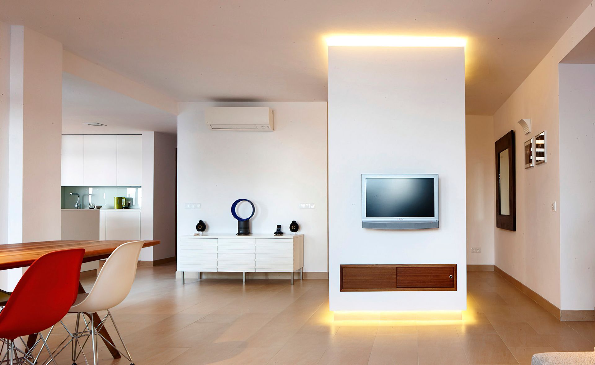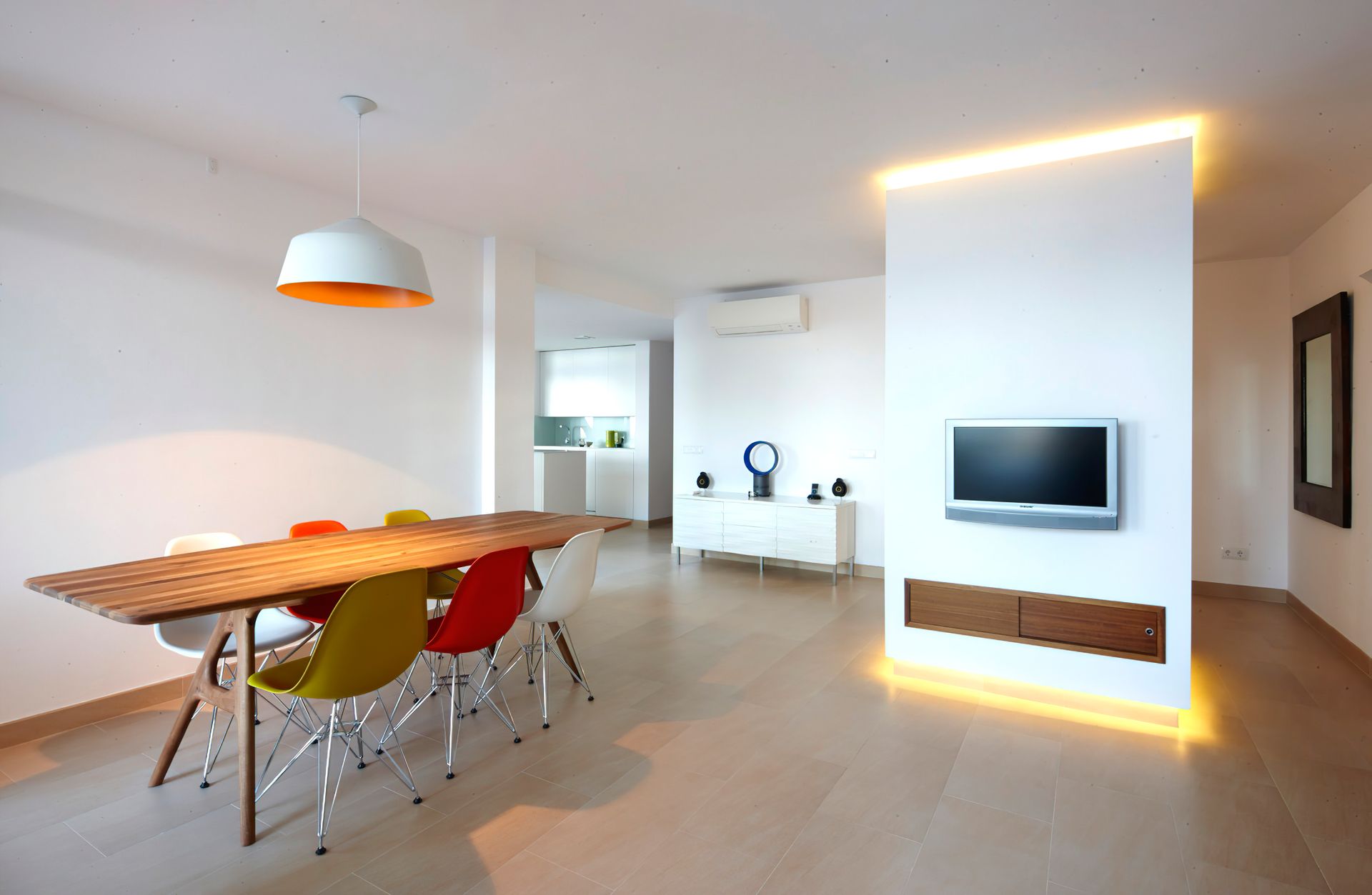 We find many partitions, small spaces that convey an oppressive feeling, something paradoxical in a house with sea views. We tackle the challenge of releasing the full potential of the home, opening it to the Mediterranean Sea and letting light flood its rooms. Our proposal offers a design that plays with the staggered façade of the building, articulating and seeking the maximum amplitude of interior spaces through long internal diagonal visuals and enhancing the privileged views of the sea while also seeking exterior light. The bedrooms are located on the north façade, with smaller façade openings. The materials and colors chosen give serenity to the whole, creating a curtain where the modern design furniture is located. Only three are used throughout the house: iroko wood for interior and exterior carpentry; Porcelain floor with sandstone color and texture (similar to Santanyí stone), and white for the walls and kitchen. The result speaks for itself of the transformation experienced and the success of the intervention.