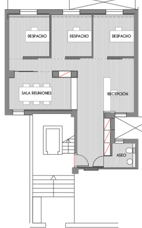 Desde la entrada al espacio crear una gran zona pública amplia y despejada donde se realizan las actividades de cara al público: recepción, sala de espera y sala de juntas. - MAXIMO DE DESPACHOS POSIBLES