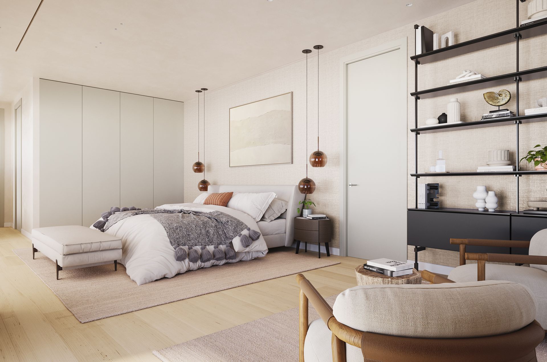 En la planta piso, reformamos los tres dormitorios y los dos baños, siguiendo la misma línea estética que en la planta baja. En el dormitorio principal, creamos un vestidor y un baño en suite, con una bañera exenta y una ducha de obra. Los otros dos dormitorios comparten un baño, con un lavabo doble y una ducha de cristal.