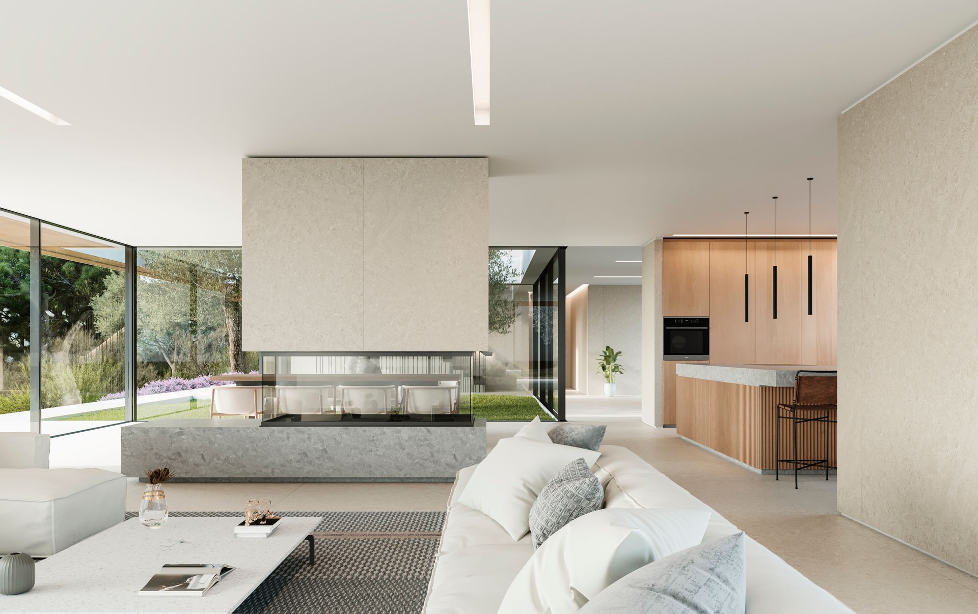 Desde el jardín, a medida que avanzamos, podemos ver espacios abiertos con grandes ventanales donde la luz natural es la gran protagonista de los interiores.