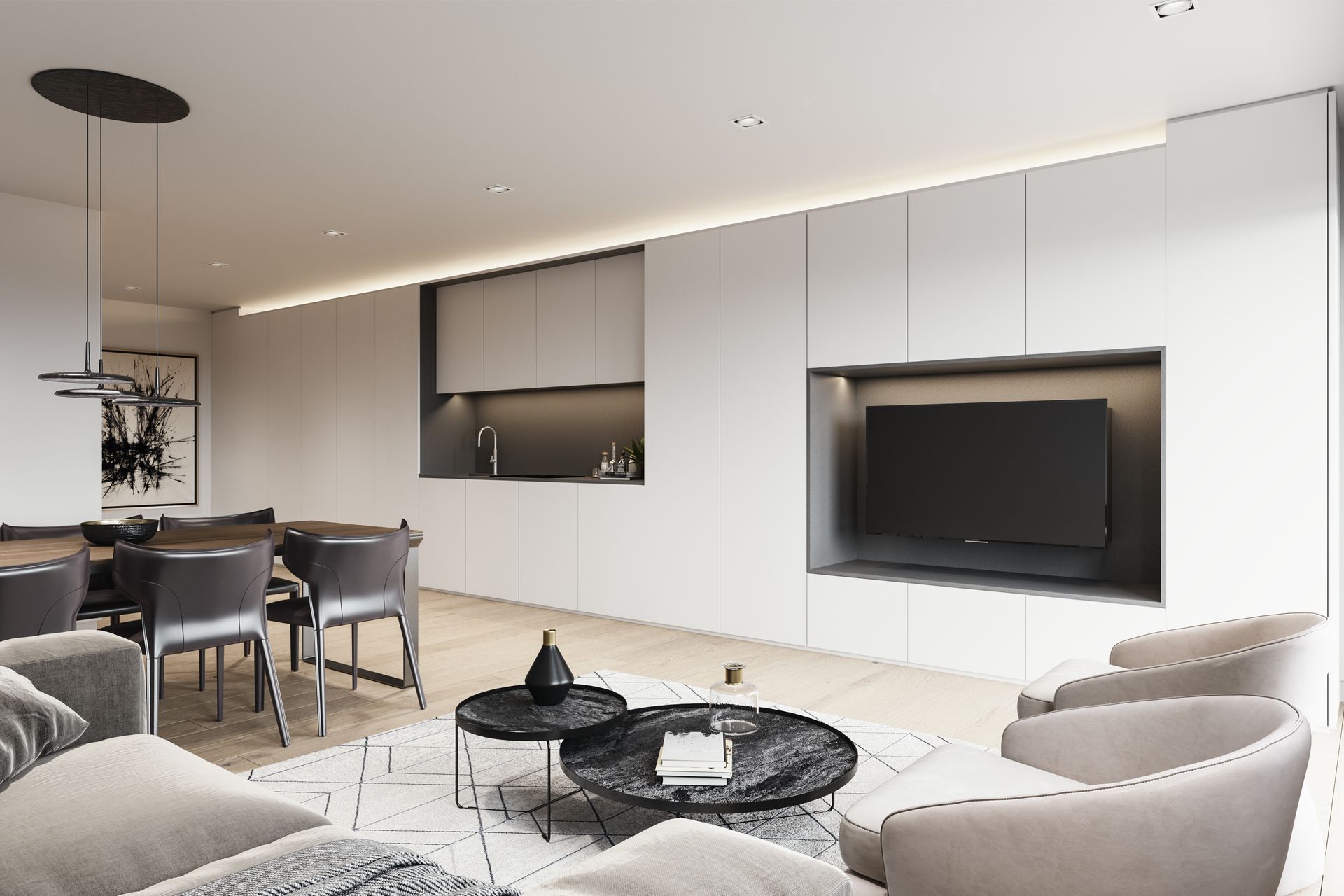 Nuestro despacho de arquitectura propone un diseño de interiores con un frente de armarios que recorre toda la zona de estar comedor cocina y que cumple diferentes funciones. En él encontramos zonas de almacenaje, la cocina, la lavandería…. Todo oculto tras un frente continuo y homogéneo donde destacan, en un material diferente, la cocina y la zona de la televisión.