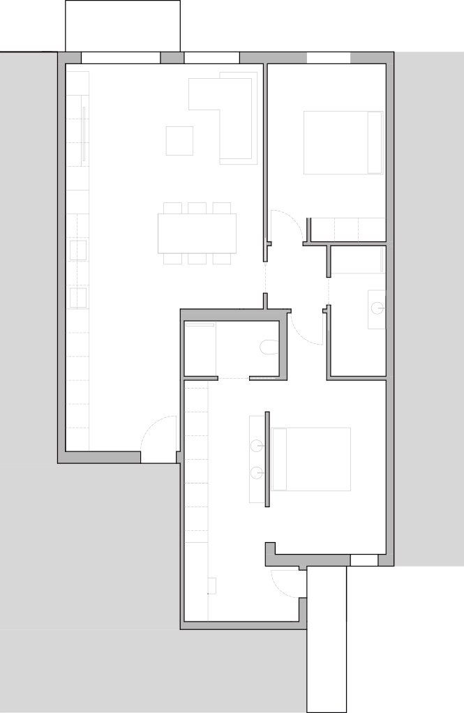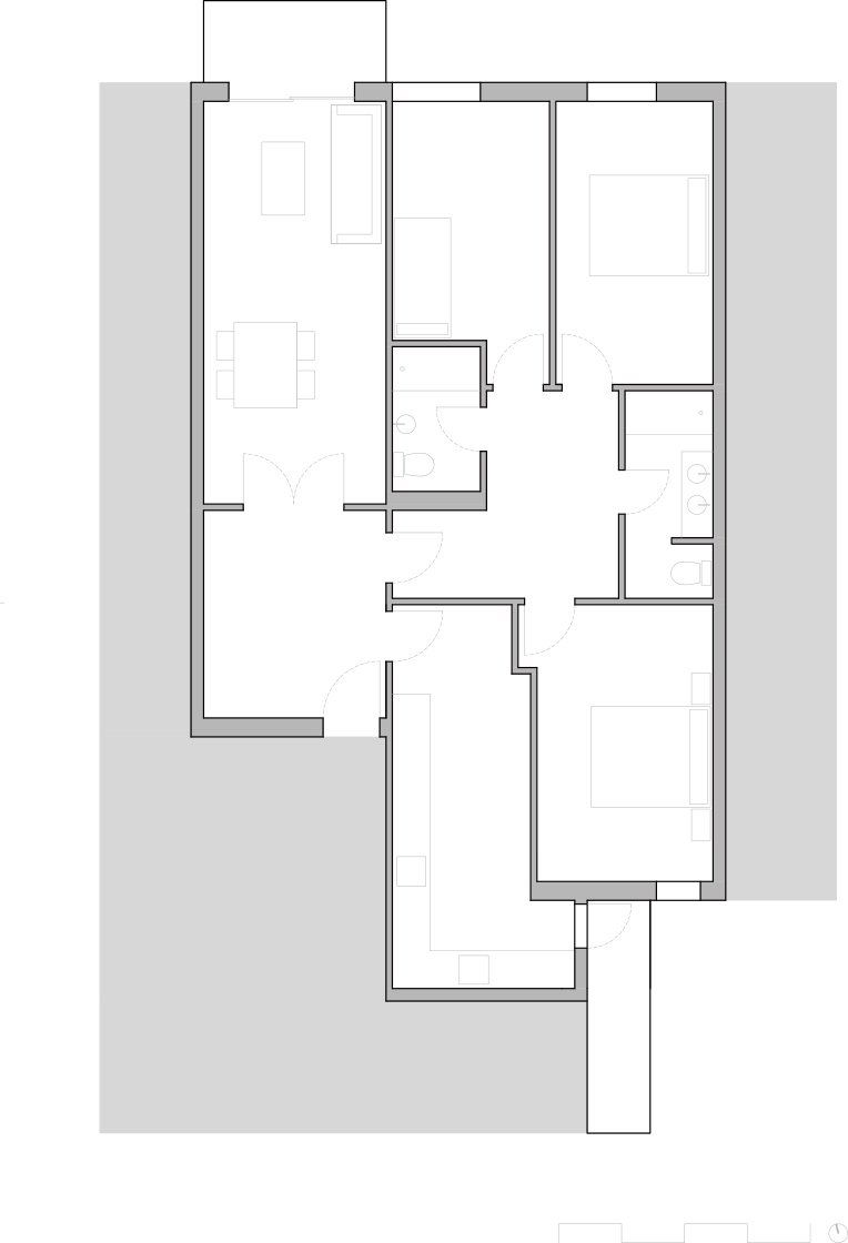 La vivienda presenta una planta ortogonal con una distribución que no aprovecha el potencial de la vivienda. Las zonas de recorridos son excesivamente grandes y las estancias demasiado justas.